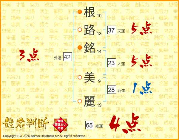 根(10画)路(13画)銘(14画) 美(9画)麗(19画)