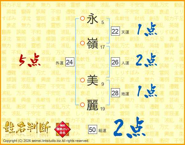 永(5画)嶺(17画) 美(9画)麗(19画)