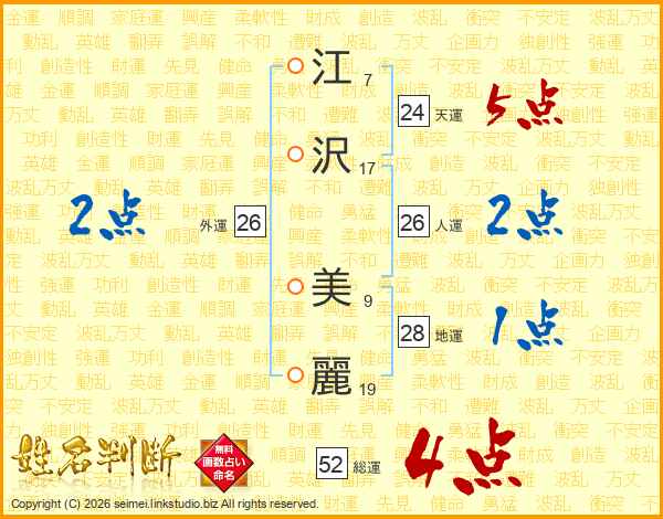 江(7画)沢(17画) 美(9画)麗(19画)