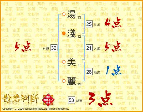 湯(13画)淺(12画) 美(9画)麗(19画)
