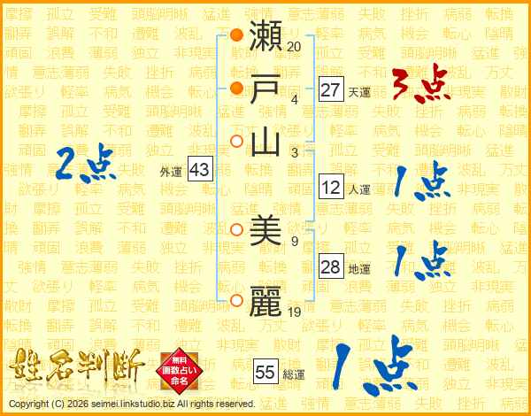 瀬(20画)戸(4画)山(3画) 美(9画)麗(19画)