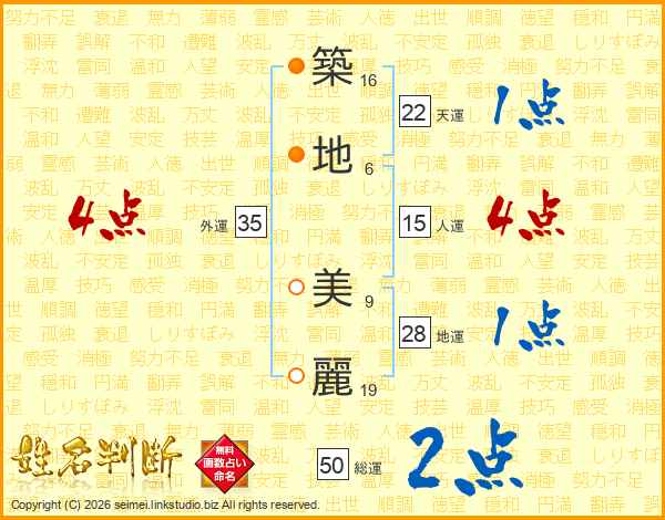 築(16画)地(6画) 美(9画)麗(19画)