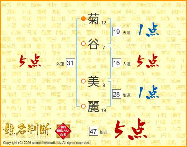 菊(12画)谷(7画) 美(9画)麗(19画)