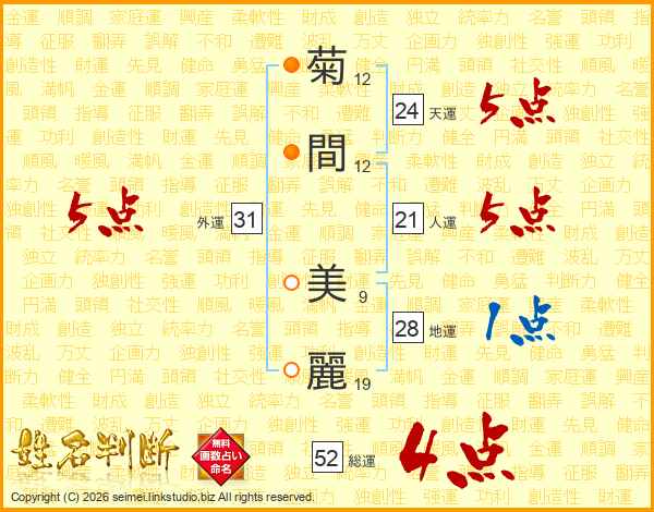 菊間美麗さんの総運は52画の4点!