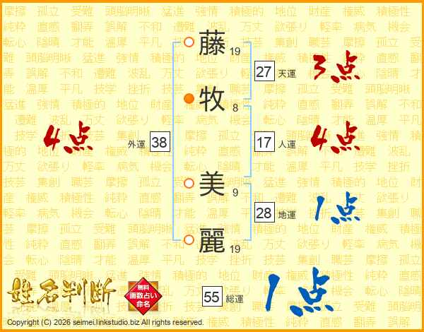 藤(19画)牧(8画) 美(9画)麗(19画)
