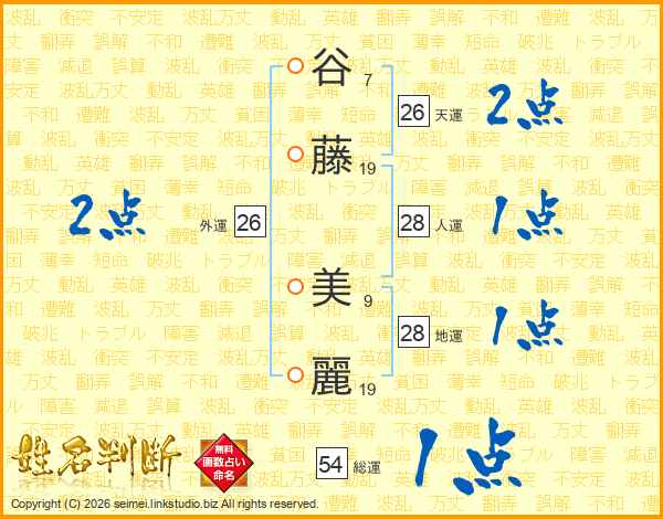 谷(7画)藤(19画) 美(9画)麗(19画)