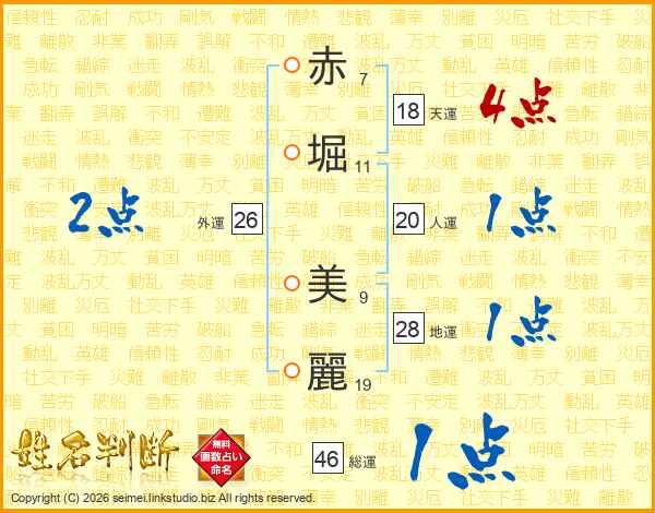 赤(7画)堀(11画) 美(9画)麗(19画)