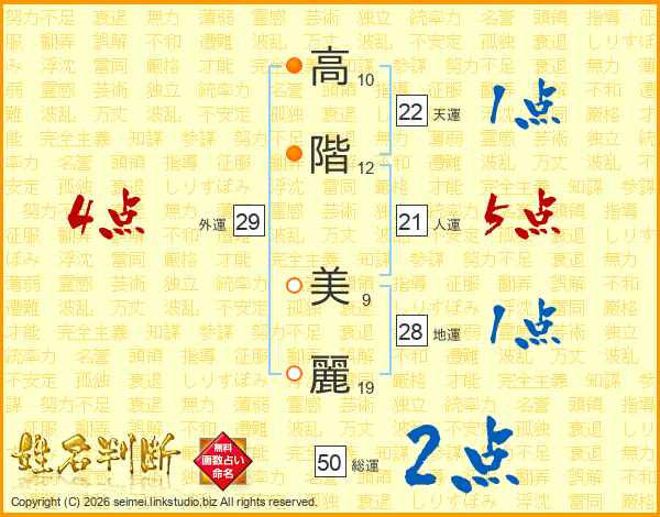 高(10画)階(12画) 美(9画)麗(19画)