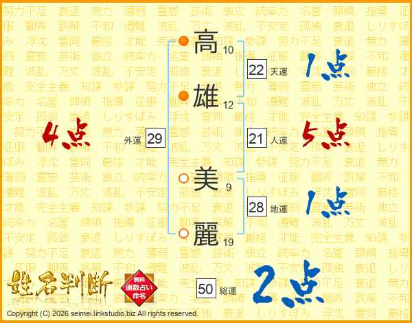 高(10画)雄(12画) 美(9画)麗(19画)