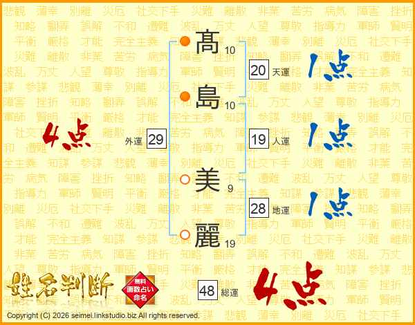 髙(10画)島(10画) 美(9画)麗(19画)