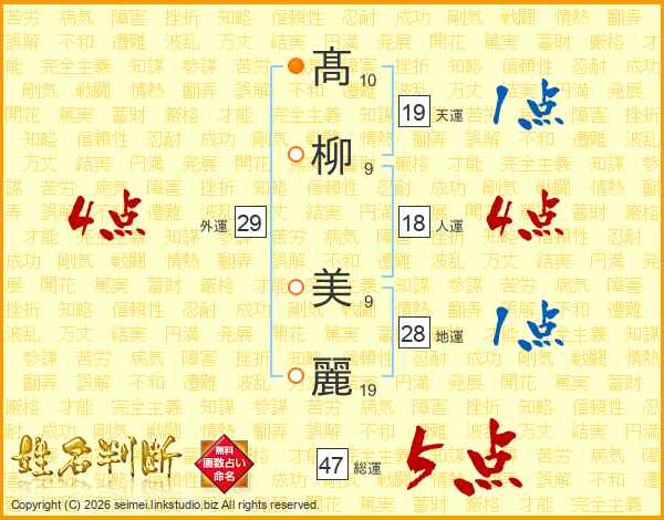 髙(10画)柳(9画) 美(9画)麗(19画)