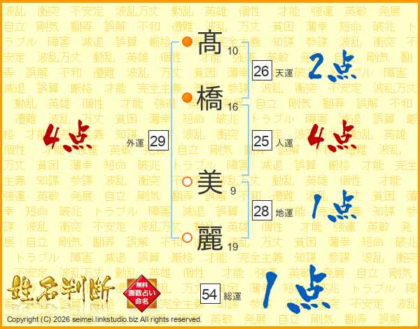 髙(10画)橋(16画) 美(9画)麗(19画)