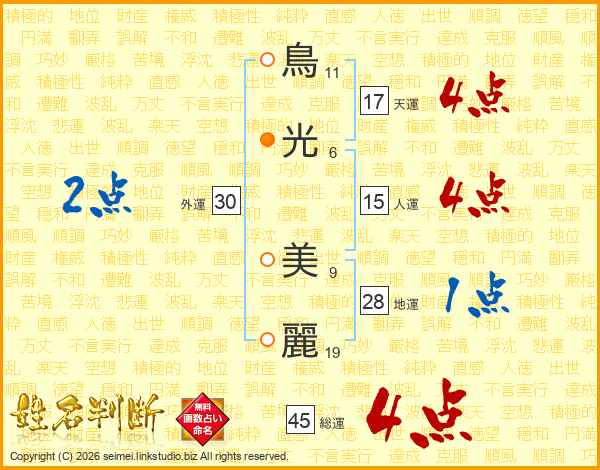 鳥光美麗さんの総運は45画の4点!