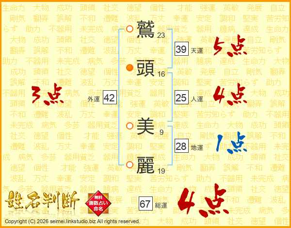 鷲頭美麗さんの総運は67画の4点!