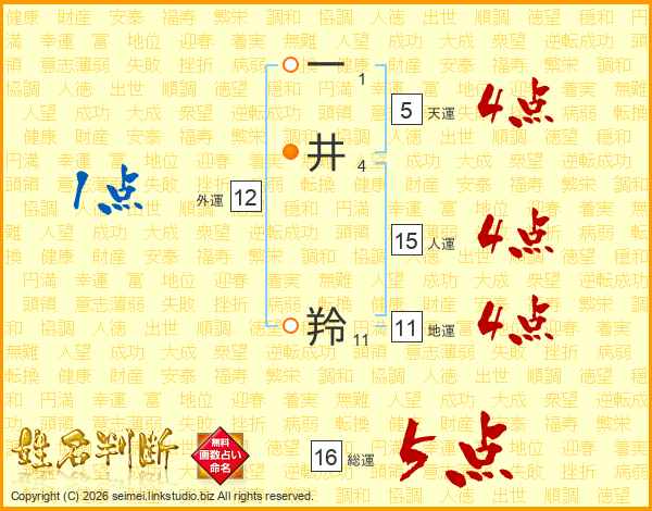 生活面を象徴する運勢です。外部から受ける影響力を表し、結婚運、家庭運や職場、環境への順応性を表します。総運から人運を引いた画数。姓や名が1文字の場合を除く。