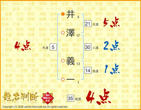 生活面を象徴する運勢です。外部から受ける影響力を表し、結婚運、家庭運や職場、環境への順応性を表します。総運から人運を引いた画数。姓や名が1文字の場合を除く。