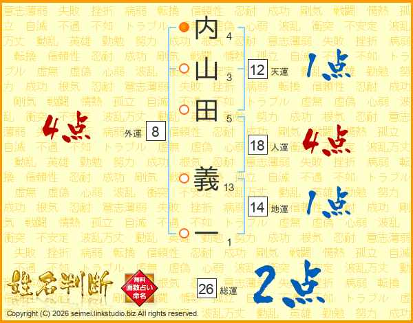 内(4画)山(3画)田(5画) 義(13画)一(1画)