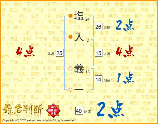 生活面を象徴する運勢です。外部から受ける影響力を表し、結婚運、家庭運や職場、環境への順応性を表します。総運から人運を引いた画数。姓や名が1文字の場合を除く。
