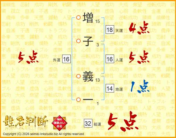 あなたの人生を表す1番重要な運勢です。生涯を通じて影響する総合運となり、主に50歳以降の晩年期に影響を及ぼします。苗字と名前の合計画数。