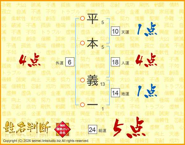 生活面を象徴する運勢です。外部から受ける影響力を表し、結婚運、家庭運や職場、環境への順応性を表します。総運から人運を引いた画数。姓や名が1文字の場合を除く。