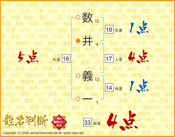 生活面を象徴する運勢です。外部から受ける影響力を表し、結婚運、家庭運や職場、環境への順応性を表します。総運から人運を引いた画数。姓や名が1文字の場合を除く。