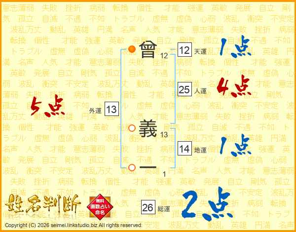 生活面を象徴する運勢です。外部から受ける影響力を表し、結婚運、家庭運や職場、環境への順応性を表します。総運から人運を引いた画数。姓や名が1文字の場合を除く。