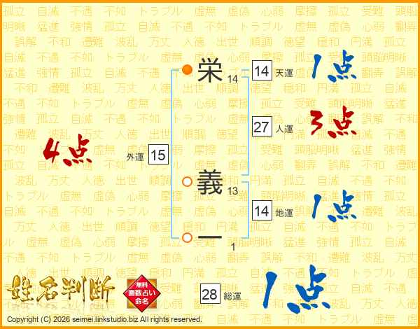 生活面を象徴する運勢です。外部から受ける影響力を表し、結婚運、家庭運や職場、環境への順応性を表します。総運から人運を引いた画数。姓や名が1文字の場合を除く。