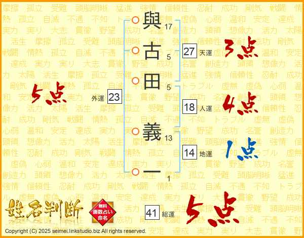 與(17画)古(5画)田(5画) 義(13画)一(1画)
