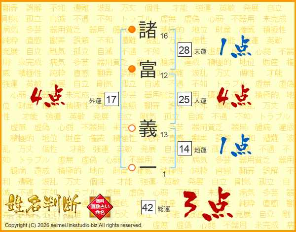 諸(16画)富(12画) 義(13画)一(1画)