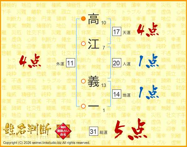 生活面を象徴する運勢です。外部から受ける影響力を表し、結婚運、家庭運や職場、環境への順応性を表します。総運から人運を引いた画数。姓や名が1文字の場合を除く。