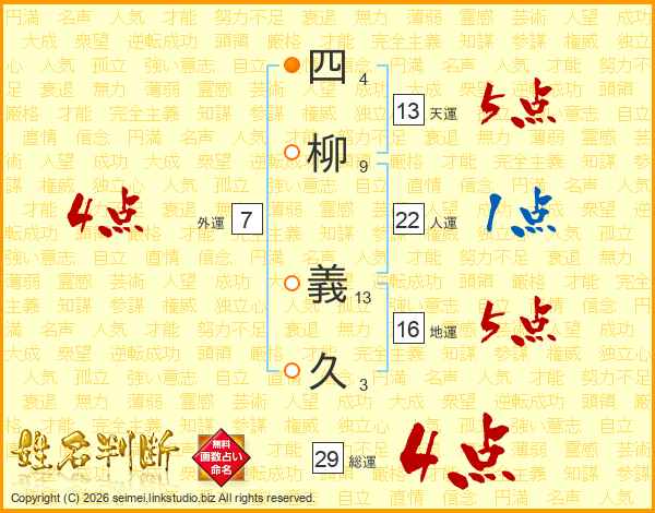 四柳義久さんの総運は29画の4点!