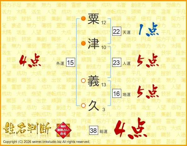 生活面を象徴する運勢です。外部から受ける影響力を表し、結婚運、家庭運や職場、環境への順応性を表します。総運から人運を引いた画数。姓や名が1文字の場合を除く。