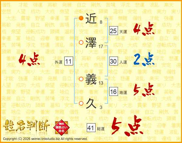 家系が持つ宿命的な運勢を表します。祖先から受け継いだ苗字ですので自分の力が及びません。家柄を象徴します。苗字の合計画数。