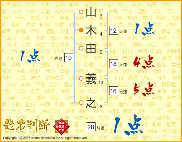 山(3画)木(4画)田(5画) 義(13画)之(3画)