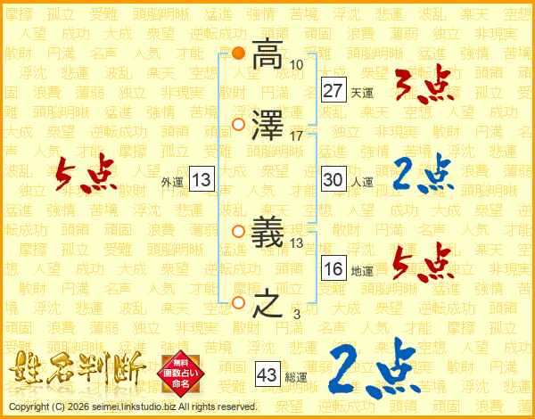 あなたの人生を表す1番重要な運勢です。生涯を通じて影響する総合運となり、主に50歳以降の晩年期に影響を及ぼします。苗字と名前の合計画数。