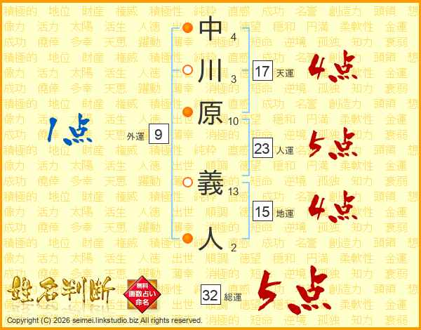 中川原義人さんの総運は32画の5点!