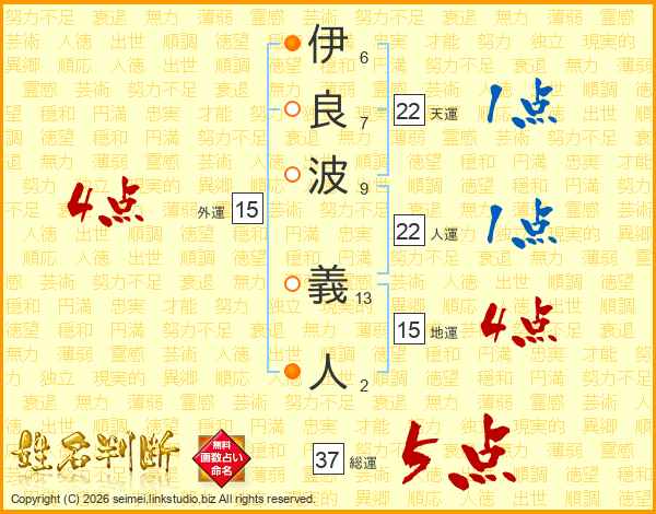 伊(6画)良(7画)波(9画) 義(13画)人(2画)