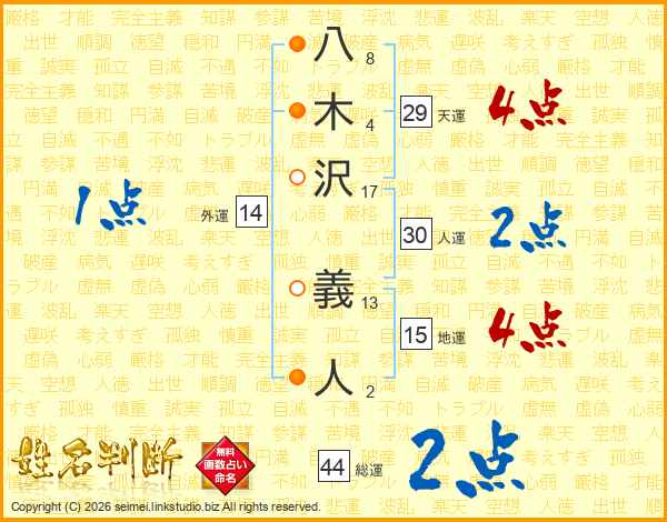 八木沢義人さんの総運は44画の2点!