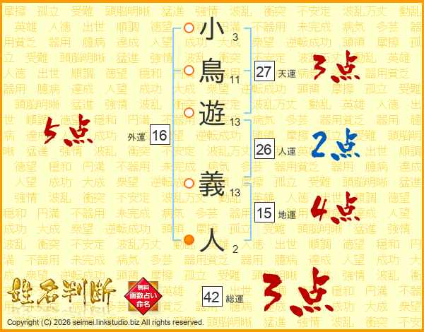 小鳥遊義人さんの人運は26画の2点!