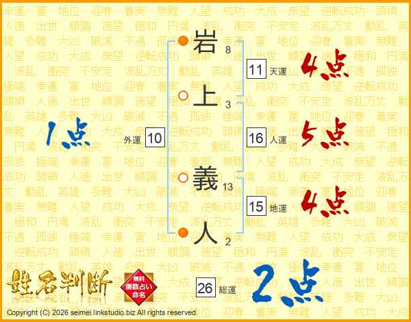 生活面を象徴する運勢です。外部から受ける影響力を表し、結婚運、家庭運や職場、環境への順応性を表します。総運から人運を引いた画数。姓や名が1文字の場合を除く。
