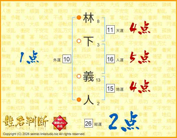 生活面を象徴する運勢です。外部から受ける影響力を表し、結婚運、家庭運や職場、環境への順応性を表します。総運から人運を引いた画数。姓や名が1文字の場合を除く。