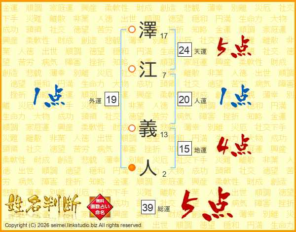 生活面を象徴する運勢です。外部から受ける影響力を表し、結婚運、家庭運や職場、環境への順応性を表します。総運から人運を引いた画数。姓や名が1文字の場合を除く。