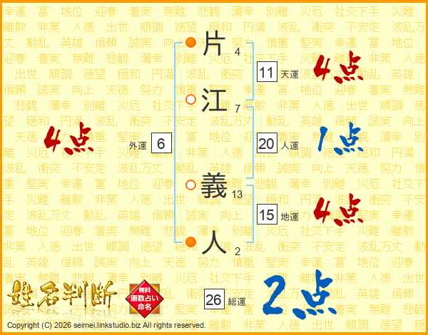 画数の奇数(○陽)と偶数(●陰)の配列で吉凶を占います。どちらかにかたよる名前は大凶名で避ける必要があります。画数の奇数偶数。