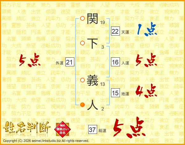 生活面を象徴する運勢です。外部から受ける影響力を表し、結婚運、家庭運や職場、環境への順応性を表します。総運から人運を引いた画数。姓や名が1文字の場合を除く。
