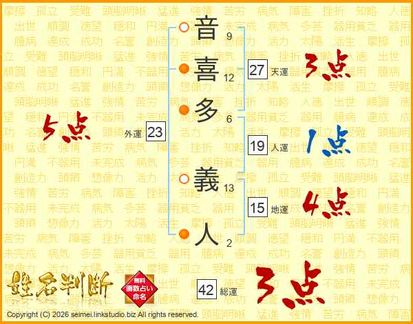 音(9画)喜(12画)多(6画) 義(13画)人(2画)