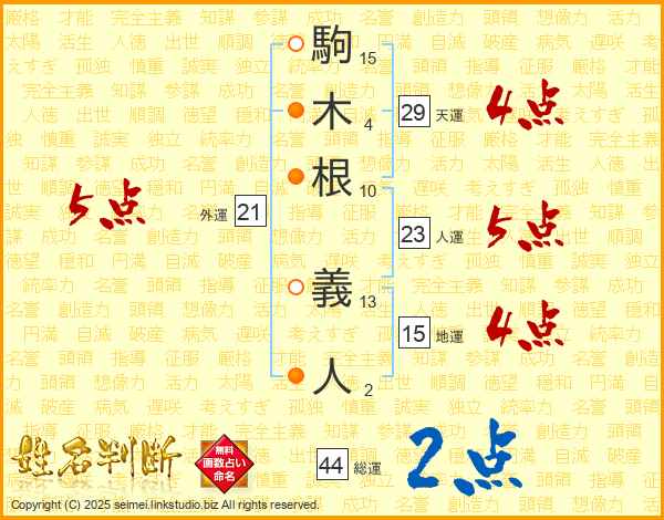 駒(15画)木(4画)根(10画) 義(13画)人(2画)