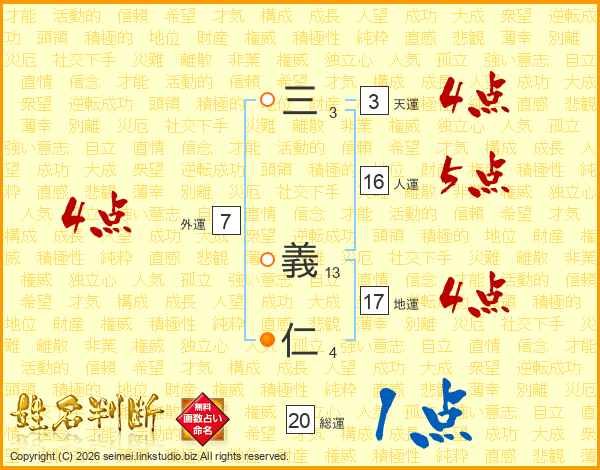 生活面を象徴する運勢です。外部から受ける影響力を表し、結婚運、家庭運や職場、環境への順応性を表します。総運から人運を引いた画数。姓や名が1文字の場合を除く。