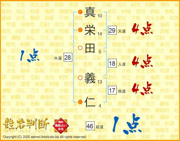 真(10画)栄(14画)田(5画) 義(13画)仁(4画)