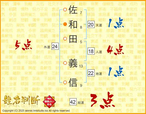 佐(7画)和(8画)田(5画) 義(13画)信(9画)
