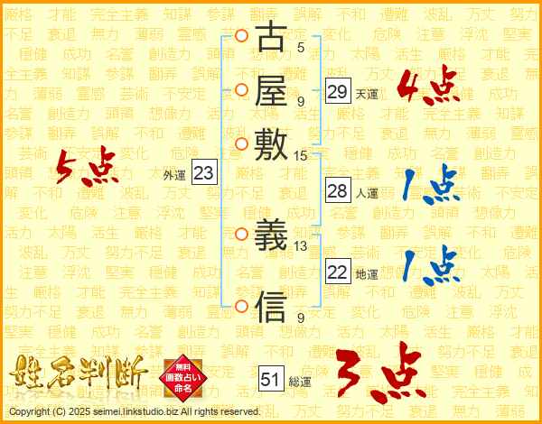 古(5画)屋(9画)敷(15画) 義(13画)信(9画)